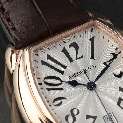 Cette montre Aerowatch a un boîtier Inox 37 mm en diamètre et est équipée d'un bracelet cuir. Le boîtier contient un mouvement Sellita et la montre est dotée d'un cristal Saphire..