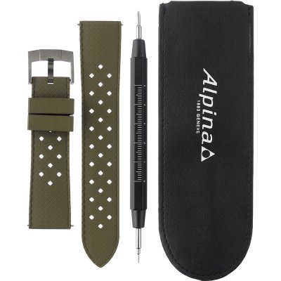 Ce bracelet de montre Alpinaest fait de caoutchouc et est attaché à la montre au moyen de Épingles à ressort. Le bracelet a une taille de 21 mm et se ferme au moyen d'un boucle. Le bracelet est doté d'une monture droite, ce qui signifie qu'il convient à toutes les montres de la Alpina dotées d'une monture droite..