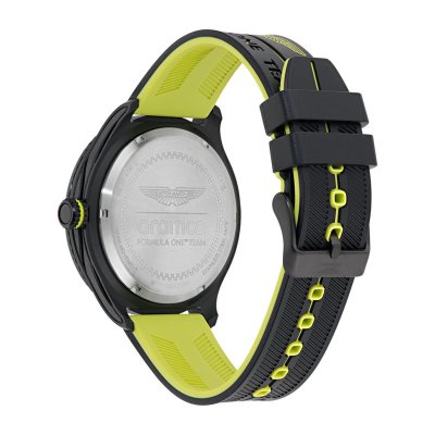 Cette montre Aston Martin a un boîtier Résine 46 mm en diamètre et est équipée d'un bracelet caoutchouc. Le boîtier contient un mouvement Timex et la montre est dotée d'un cristal Minéral..