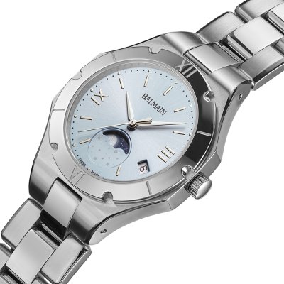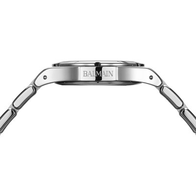 Cette montre Balmain a un boîtier Inox 33 mm en diamètre et est équipée d'un bracelet Inox. Le boîtier contient un mouvement ETA et la montre est dotée d'un cristal Saphire..