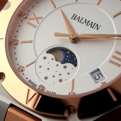 Cette montre Balmain a un boîtier Inox 33 mm en diamètre et est équipée d'un bracelet Inox. Le boîtier contient un mouvement ETA et la montre est dotée d'un cristal Saphire..