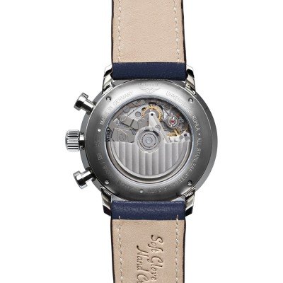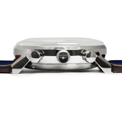 Ce chronographe automatique de style aviateur, à la fois moderne et classique, associe le design épuré du Bauhaus à des détails subtils. Par exemple, les petits points lumineux à 3, 6 et 9 heures, ainsi que le triangle et le double point à 12 heures, dans le style aviateur classique. Les aiguilles dorées contrastent avec le cadran bleu nuit dans lequel les sous-cadrans sont subtilement découpés. La montre est animée par un mouvement suisse Sellita SW500 de 25 rubis avec une réserve de marche de 48 heures.