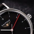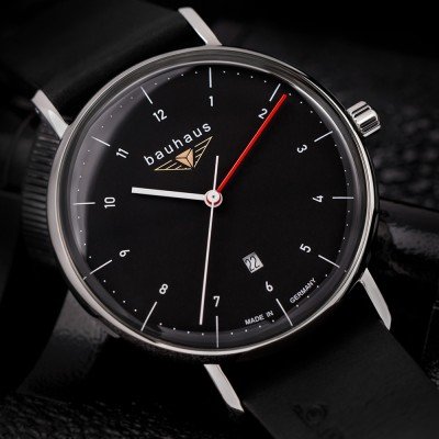 Cette montre Bauhaus a un boîtier Inox 41 mm en diamètre et est équipée d'un bracelet cuir. Le boîtier contient un mouvement Ronda et la montre est dotée d'un cristal K1 Minéral..