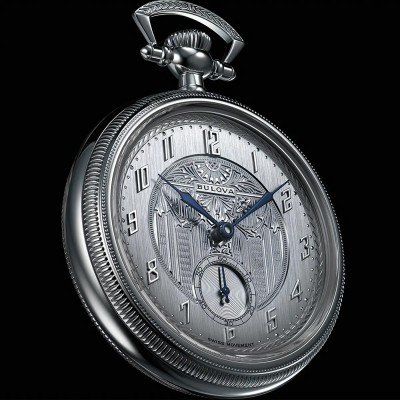 Pour célébrer son 150e anniversaire, Bulova a sorti cette magnifique montre de poche limitée à 300 pièces numérotées individuellement. Pour le design, Bulova s'est inspiré de plusieurs modèles Art déco des années 1920, célébrant ainsi le savoir-faire artistique qui définit depuis longtemps Bulova. Cette montre comprend un boîtier en acier inoxydable de couleur argentée avec un nœud texturé. Cadran en argent sterling véritable, aiguilles bleues, gravure complexe et anneau des heures brossé. Le fond du boîtier est gravé du logo du 150e anniversaire. La chaîne à maillons personnalisée de 15,8 pouces, magnifiquement décorée, s'inspire de la montre de poche vintage originale. Enfin, la montre est animée par un mouvement mécanique suisse à remontage automatique avec une réserve de marche respectable de 62 heures.
