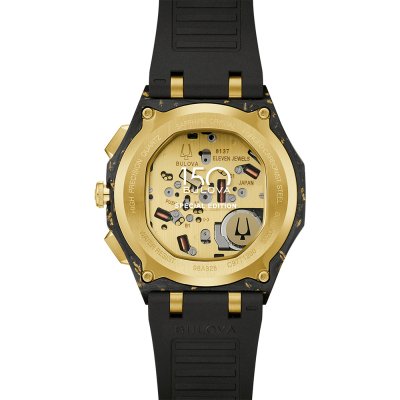 Cette montre Bulova a un boîtier Résine renforcée de carbone 44 mm en diamètre et est équipée d'un bracelet caoutchouc. Le boîtier contient un mouvement Bulova et la montre est dotée d'un cristal Saphir antireflet unique..