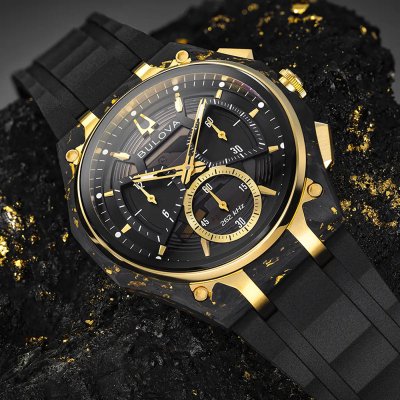 La Bulova Curv est une merveille d'ingénierie technique dotée d'un design ergonomique et d'un boîtier mince, ce qui n'avait jamais été le cas auparavant pour une montre chronographe. Bulova bouscule les règles avec le premier mouvement chronographe incurvé au monde. Toutes les montres Curv sont équipées d'un mouvement à quartz de haute précision exclusif, d'une fréquence de 262 kHz, qui offre une précision extraordinaire. Découvrez notre Curv 2025. Un nouveau design et de nouveaux matériaux innovants convergent pour créer ce boîtier saisissant. Le carbone forgé est associé à une feuille d'or pure à 97,97 % pour abriter notre mouvement Curv. Le cadre du boîtier met en valeur le nouveau design du cadran et est rehaussé d'un bracelet en caoutchouc HNBR de première qualité et d'une boucle déployante pour un fit confortable au poignet.