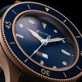 Cette édition spéciale de la montre de plongée MIL-SHIPS est basée sur un prototype développé en collaboration avec l'US Navy en 1957. La montre célèbre le 150e anniversaire de Bulova. La montre est dotée d'un boîtier en CuSn8-Bronze sablé, de la couleur d'un casque de plongée du 19e siècle. Il s'agit d'un matériau très résistant qui se patinera naturellement avec le temps. Le cadran bleu intense est assorti à la lunette bidirectionnelle en aluminium pour un look d'inspiration vintage. Il est orné de marques super brillantes, d'un indicateur d'humidité bicolore et d'un verre saphir doté d'une protection antireflet à 5 couches. Le bracelet est fabriqué à partir d'un moulage spécial en caoutchouc et en nylon Cordura® pour plus de durabilité et de confort. Le fond du boîtier est gravé pour célébrer les 150 ans de Bulova.