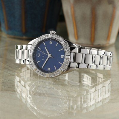 Cette montre Bulova a un boîtier Inox 32.5 mm en diamètre et est équipée d'un bracelet Inox. Le boîtier contient un mouvement Miyota et la montre est dotée d'un cristal Saphire..