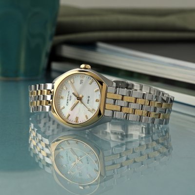 Cette montre Certina a un boîtier Inox 28 mm en diamètre et est équipée d'un bracelet Inox. Le boîtier contient un mouvement ETA et la montre est dotée d'un cristal Saphir antireflet unique..