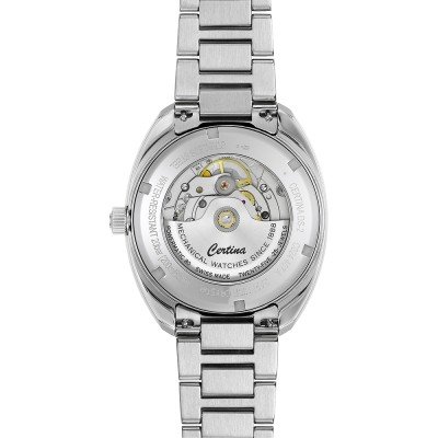 Cette montre Certina a un boîtier Inox 40 mm en diamètre et est équipée d'un bracelet Inox. Le boîtier contient un mouvement ETA et la montre est dotée d'un cristal Saphire..