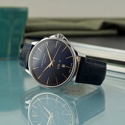 Cette montre Certina a un boîtier Inox 40 mm en diamètre et est équipée d'un bracelet cuir. Le boîtier contient un mouvement ETA et la montre est dotée d'un cristal Saphir antireflet unique..
