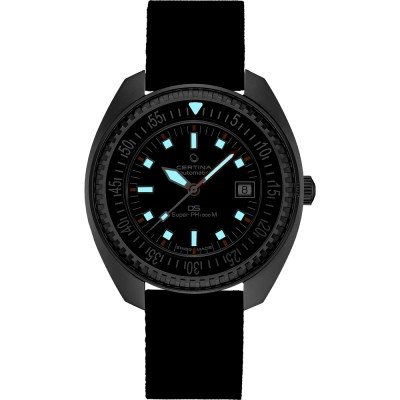 Cette montre Certina a un boîtier Inox 43.5 mm en diamètre et est équipée d'un bracelet Textile. Le boîtier contient un mouvement ETA et la montre est dotée d'un cristal Saphir antireflet unique..
