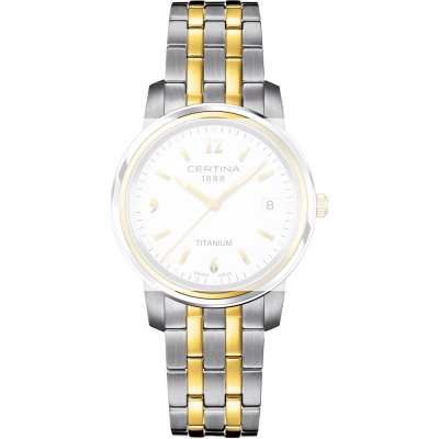 Ce bracelet de montre Certinaest fait de titane et est attaché à la montre au moyen de Épingles à ressort. Le bracelet a une taille de 18 mm et se ferme au moyen d'un boucle papillon avec boutons poussoirs. Le bracelet n'a pas de support droit, ce qui signifie que ce bracelet convient uniquement aux montres énumérées ci-dessous.