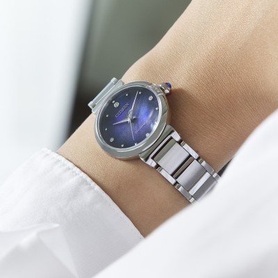 Cette magnifique montre pour femmes Citizen L s'inspire de la beauté de la mer bleue et calme. Quatre diamants authentiques sur le cadran représentent la surface étincelante de la mer, avec des bulles d'air remontant des profondeurs. Cette montre fait partie de la collection exclusive Unite in blue et a été limitée à 2000 exemplaires dans le monde. Le mouvement solaire Cal. E031 Eco-Drive a une précision de ±15 secondes par mois et fonctionne pendant 6 mois avec une charge complète. La montre est étanche à 5 atm. En plus d'être précise et fiable, cette montre pour femmes respectueuse de l'environnement est stylée et élégante. Un verre saphir bombé, une couronne en cabochon bleu et des cristaux sur le boîtier ajoutent une touche de luxe supplémentaire.