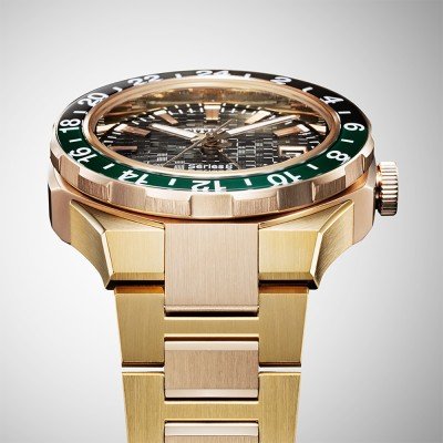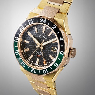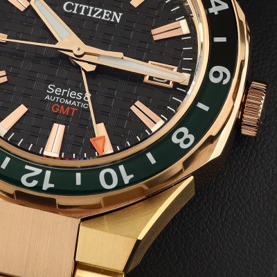 Cette montre Citizen d'une beauté exceptionnelle est également une particularité de la collection Citizen. Tout d'abord, il s'agit d'une montre automatique de la ligne Series 8. Cette série se compose de montres robustes mais de grande qualité, au look sportif. Deuxièmement, la montre en acier est recouverte d'un revêtement PVD dans deux nuances d'or : l'or jaune et l'or rose. Cette combinaison de couleurs frappante est encore rehaussée par la lunette vert foncé, tandis que le cadran sombre avec son motif en mosaïque ajoute encore plus de profondeur. En outre, il s'agit d'une montre GMT très fonctionnelle : Etanche à 10 ATM, elle est équipée d'un guichet de date à 3 heures et d'une aiguille GMT clairement lisible pour le réglage d'un second fuseau horaire. De plus, la montre est dotée d'un verre saphir inrayable au recto et au verso.