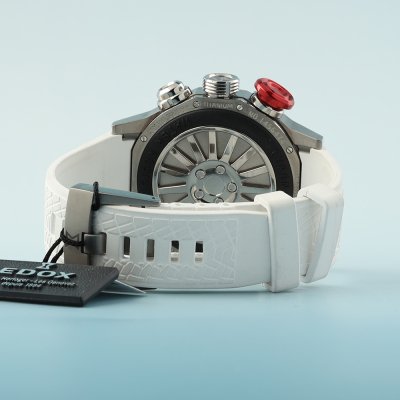 Cette montre Edox a un boîtier Titane 48 mm en diamètre et est équipée d'un bracelet caoutchouc. Le boîtier contient un mouvement Ronda et la montre est dotée d'un cristal Saphire..