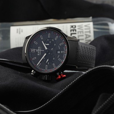 Cette montre Edox a un boîtier Inox 45 mm en diamètre et est équipée d'un bracelet caoutchouc. Le boîtier contient un mouvement Ronda et la montre est dotée d'un cristal Saphire..