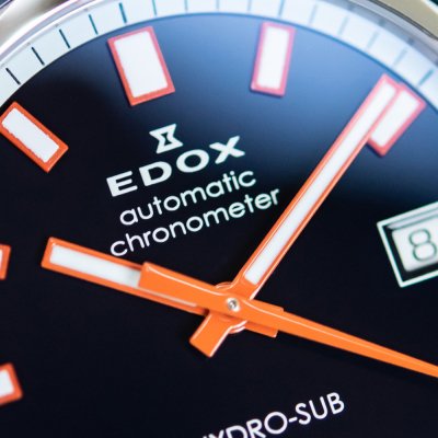 Cette Edox Hydro-Sub est une édition spéciale limitée à 500 exemplaires. Elle est étanche jusqu'à 30 ATM et est animée par un mouvement automatique Edox Calibre 806 basé sur le Sellita SW200 et certifié COSC. Son design classique est rehaussé par la subtile lunette en céramique et les aiguilles et index lumineux proéminents.