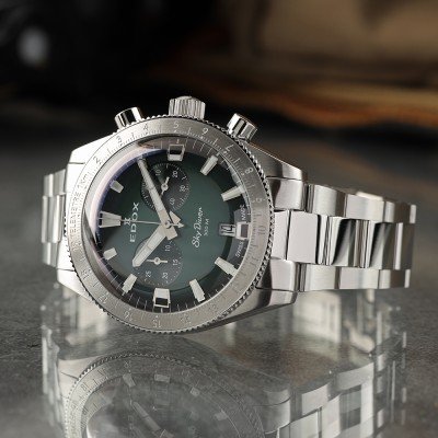 La montre Edox Skydiver, limitée à 1000 exemplaires pour le monde entier, est un chronographe moderne qui allie fonctionnalité et esthétique sportive. La montre est dotée d'un boîtier en acier inoxydable qui attire tous les regards grâce à sa surface mate/polie, sa lunette subtilement dentelée et son verre saphir bombé. Avec une résistance à l'eau de 30 ATM, la Skydiver se sent à l'aise sur terre, dans l'air et sous l'eau. Grâce au bracelet en cuir supplémentaire fourni avec la montre, vous pouvez passer d'un look décontracté à un look plus habillé.