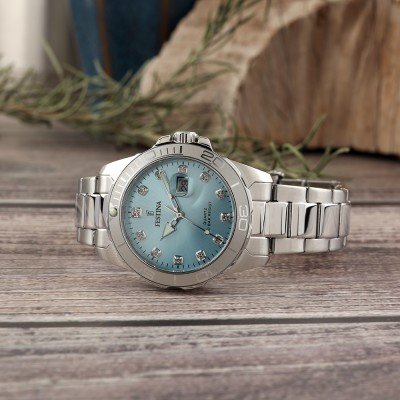Cette montre Festina a un boîtier Inox 34 mm en diamètre et est équipée d'un bracelet Inox. Le boîtier contient un mouvement Miyota et la montre est dotée d'un cristal Minéral..