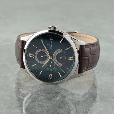 Cette montre Festina a un boîtier Inox 43 mm en diamètre et est équipée d'un bracelet cuir. Le boîtier contient un mouvement Miyota et la montre est dotée d'un cristal Minéral..