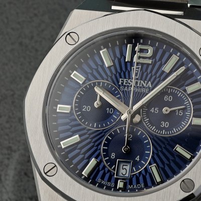 Cette montre Festina a un boîtier Inox 42 mm en diamètre et est équipée d'un bracelet Inox. Le boîtier contient un mouvement Ronda et la montre est dotée d'un cristal Saphire..