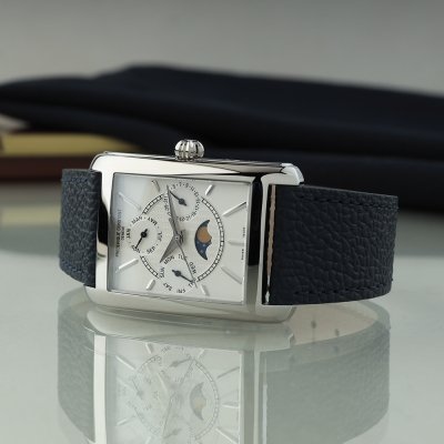 La montre Frederique Constant Classics Carrée Moonphase est une pièce d'horlogerie raffiné et exceptionnel aux multiples fonctions. Le mouvement à quartz FC-265 indique les heures, les minutes, les secondes, ainsi que la date, le jour, le mois et la phase de lune, avec une autonomie impressionnante de 60 mois. Le tout est logé dans un boîtier rectangulaire de 42,30 x 30 mm, en acier inoxydable plaqué or jaune poli. Le cadran argenté avec une finition soleillée et un motif gaufré au centre est compensé par des index et des aiguilles plaqués or, offrant une lisibilité parfaite.