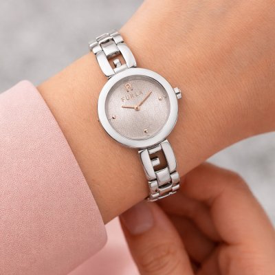 Cette montre Furla a un boîtier Inox 24 mm en diamètre et est équipée d'un bracelet Inox. Le boîtier contient un mouvement Miyota et la montre est dotée d'un cristal Minéral..