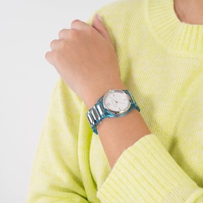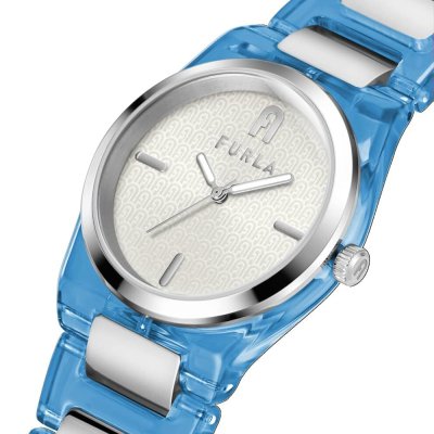 Cette montre Furla a un boîtier Acier inoxydable et plastique 34 mm en diamètre et est équipée d'un bracelet Acier inoxydable et plastique. Le boîtier contient un mouvement Miyota et la montre est dotée d'un cristal Minéral..