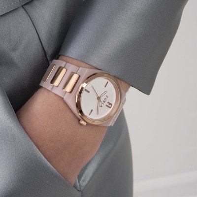 Cette montre Furla a un boîtier Acier inoxydable et plastique 34 mm en diamètre et est équipée d'un bracelet Acier inoxydable et plastique.