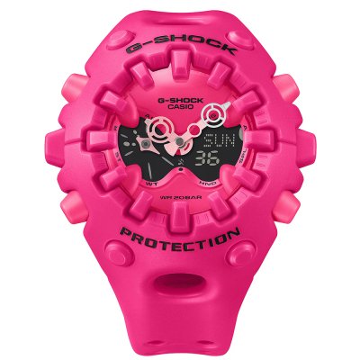 On peut parfois penser qu'il n'y a plus rien à améliorer dans les montres du 21ème siècle, mais c'est sans compter sur l'attention que l'on porte à G-Shock. Après quarante ans d'innovation constante, la marque a une fois de plus réussi à révolutionner le monde de l'horlogerie avec un design tout à fait unique et original. Avec une approche totalement nouvelle de la construction et du design, la GA-V01 n'a pas seulement une apparence spectaculaire, elle est aussi extrêmement résistante aux chocs et recèle des innovations techniques remarquables : La structure du boîtier, qui protège le mouvement, utilise une lunette et un bracelet intégrés qui recouvrent partiellement le verre, faisant ainsi office de pare-chocs pour absorber les chocs. Casio a également développé une nouvelle construction d'aiguilles magnétiques, où les aiguilles, normalement vulnérables aux chocs, ne sont pas attachées à l'axe, mais sont maintenues en place par une force magnétique. Cela leur permet d'absorber et de dissiper efficacement les chocs. Cette nouvelle technologie permet également de créer des mains plus grandes et de forme unique, car l'axe n'a pas à supporter leur poids. Après un choc ou une vibration, les aiguilles peuvent se décaler temporairement, mais en quelques minutes, elles reviennent presque par magie à leur position d'origine. Le cadran analogique-numérique présente une construction en couches avec une face métallique comportant des sections en treillis, créant des aperçus décoratifs de l'intérieur, et un affichage à cristaux liquides. Cette montre n'est pas destinée à ceux qui ont peur du risque. Elle est frappante, de grande taille et ne manquera pas de faire parler d'elle ! Et vous avez la garantie d'un mouvement fort et puissant qui continue à fonctionner, quels que soient les chocs et les impacts qu'il subit !