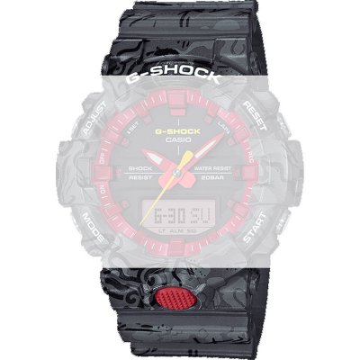 Ce bracelet de montre G-Shockest fait de résine et est attaché à la montre au moyen de Épingles à ressort. Le bracelet a une taille de 26 mm et se ferme au moyen d'un boucle. Le bracelet n'a pas de support droit, ce qui signifie que ce bracelet convient uniquement aux montres énumérées ci-dessous.