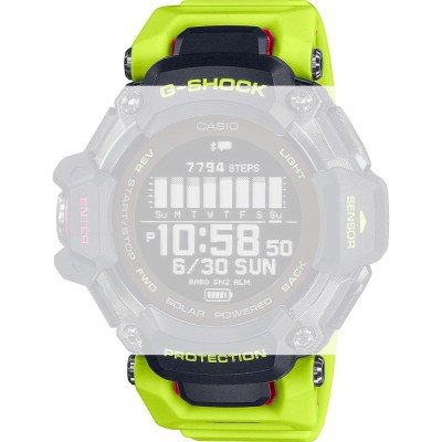 Ce bracelet de montre G-Shockest fait de résine et est attaché à la montre au moyen de vis de selle. Le bracelet a une taille de 28 mm et se ferme au moyen d'un boucle. Le bracelet n'a pas de support droit, ce qui signifie que ce bracelet convient uniquement aux montres énumérées ci-dessous.