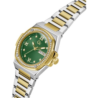 Cette montre GC a un boîtier Inox 36 mm en diamètre et est équipée d'un bracelet métal. Le boîtier contient un mouvement Ronda et la montre est dotée d'un cristal Minéral enduit saphir..