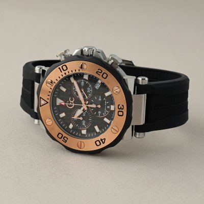 Cette montre GC a un boîtier Inox 44 mm en diamètre et est équipée d'un bracelet caoutchouc. Le boîtier contient un mouvement Ronda et la montre est dotée d'un cristal Minéral..