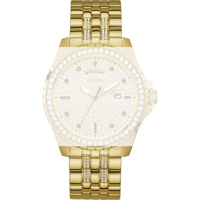 Ce bracelet de montre Guessest fait de métal et est attaché à la montre au moyen de Épingles à ressort. Le bracelet a une taille de 22 mm et se ferme au moyen d'un boucle déployante avec boutons poussoirs. Le bracelet n'a pas de support droit, ce qui signifie que ce bracelet convient uniquement aux montres énumérées ci-dessous.
