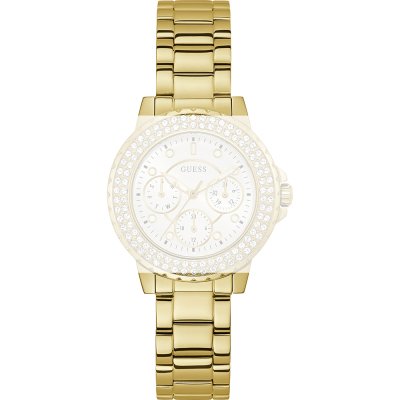 Ce bracelet de montre Guessest fait de métal et est attaché à la montre au moyen de Épingles à ressort. Le bracelet a une taille de 16 mm et se ferme au moyen d'un boucle déployante avec boutons poussoirs. Le bracelet n'a pas de support droit, ce qui signifie que ce bracelet convient uniquement aux montres énumérées ci-dessous.