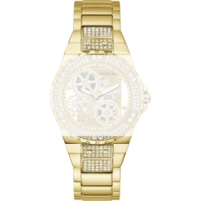 Ce bracelet de montre Guessest fait de acier inoxydable et est attaché à la montre au moyen de goupilles en acier. Le bracelet a une taille de 24 mm et se ferme au moyen d'un boucle déployante avec boutons poussoirs. Le bracelet n'a pas de support droit, ce qui signifie que ce bracelet convient uniquement aux montres énumérées ci-dessous.