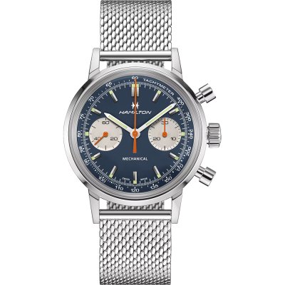 Cette montre Hamilton a un boîtier Inox 40 mm en diamètre et est équipée d'un bracelet cuir. Le boîtier contient un mouvement ETA et la montre est dotée d'un cristal Saphire double antireflet..