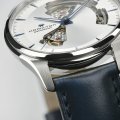 La Jazzmaster, l'une des lignes de montres les plus distinctes de Hamilton, est peut-être la plus sophistiquée et la plus élégante, tendant vers le haut de gamme en termes de finitions et de design. La montre "Open Heart" présente un cadran découpé qui laisse apparaître des zones clés du mouvement. La lisibilité de la montre reste ainsi largement intacte, tout en lui conférant son aspect caractéristique. Les rubis de la montre, le train d'engrenage, le rochet et le balancier sont exposés. Le cadran lui-même est de type radial soleil, avec des index appliqués en losange et des aiguilles Dauphine, sous un verre saphir. Le mouvement H-10 est le cheval de bataille fiable de Hamilton, avec un spiral Nivachron et une réserve de marche de 80 heures.