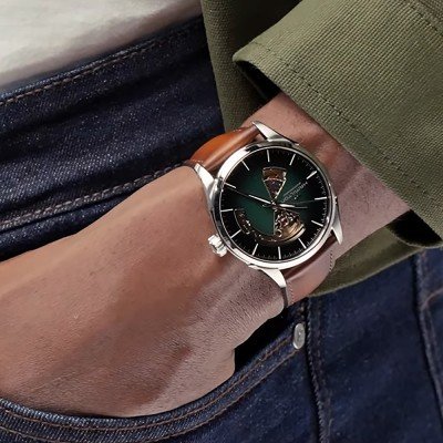 La Hamilton Jazzmaster Viewmatic équilibre parfaitement le formel et le sport en combinant un boîtier magnifiquement fini avec un mélange de surfaces polies et brossées et un cadran à cœur ouvert intrigant affichant les éléments mécaniques qui battent en dessous. Les découpes superbement exécutées dans le cadran ont une lunette très polie passant brusquement à un bord intérieur brossé, dirigeant l'œil vers le mouvement automatique H-10. Ce mouvement Hamilton très précis contient un spiral Nivachron non magnétique et dispose d'une réserve de marche de pas moins de 80 heures. La Jazzmaster Viewmatic Open Heart Auto est disponible dans une gamme de couleurs et dans des tailles de boîtier de 40 mm et 36 mm, pour hommes et femmes.