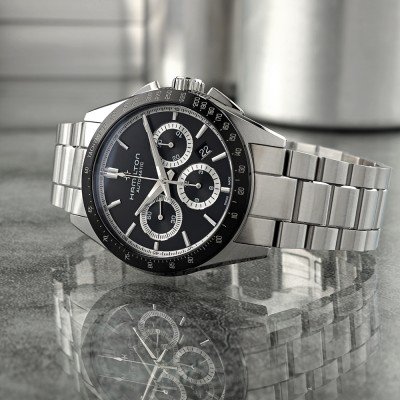 Cette montre Hamilton a un boîtier Inox 42 mm en diamètre et est équipée d'un bracelet Inox. Le boîtier contient un mouvement ETA et la montre est dotée d'un cristal Saphir antireflet unique..