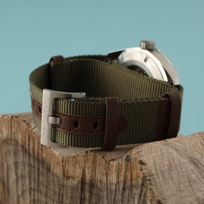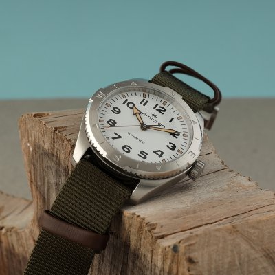 Cette montre Hamilton a un boîtier Inox 41 mm en diamètre et est équipée d'un bracelet Textile. Le boîtier contient un mouvement ETA et la montre est dotée d'un cristal Saphire..