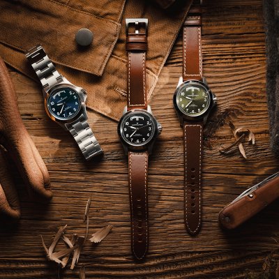 Cette montre Hamilton a un boîtier Inox 40 mm en diamètre et est équipée d'un bracelet cuir. Le boîtier contient un mouvement ETA et la montre est dotée d'un cristal Saphir antireflet unique..