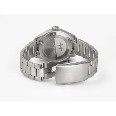 Cette montre Hamilton a un boîtier Inox 40 mm en diamètre et est équipée d'un bracelet Inox. Le boîtier contient un mouvement ETA et la montre est dotée d'un cristal Saphire..