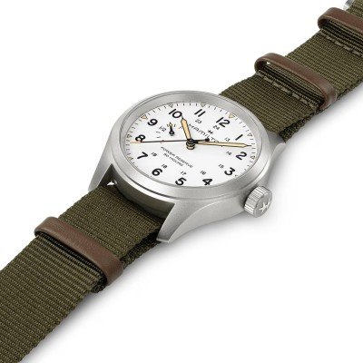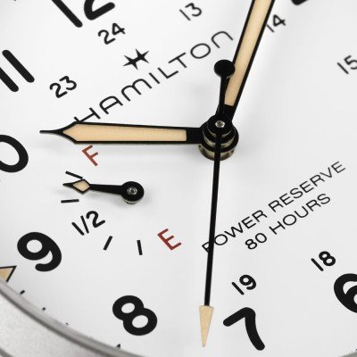 La collection Khaki de Hamilton s'est enrichie de la Khaki Field Mechanical Power Reserve. Il s'agit d'une montre de terrain militaire classique et utilitaire, dans la lignée de l'héritage militaire de Hamilton depuis 1914, connue pour sa robustesse et sa fiabilité. En plus de cet héritage, Hamilton présente aujourd'hui la première Khaki Field dotée d'un indicateur de réserve de marche sur le cadran. La montre est animée par le nouveau mouvement H-23, développé par ETA en exclusivité pour Hamilton, et est la première Khaki Field à disposer d'une impressionnante réserve de marche de 80 heures. Fidèle à ses racines utilitaires, comme une jeep militaire, l'échelle de réserve de marche sur le cadran n'indique que "F" pour pleine et "E" pour vide. Elle est accompagnée d'échelles militaires claires de 12 et 24 heures, d'aiguilles seringues lumineuses et d'index rendus dans un brun patiné vintage chaleureux, donnant à la montre l'aspect parfait d'une montre militaire vintage avec la technologie moderne.
