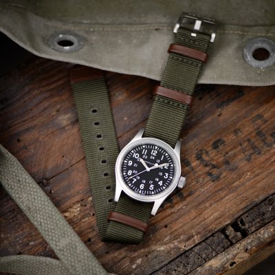 Cette montre Hamilton a un boîtier Inox 38 mm en diamètre et est équipée d'un bracelet Textile. Le boîtier contient un mouvement ETA et la montre est dotée d'un cristal Saphire..