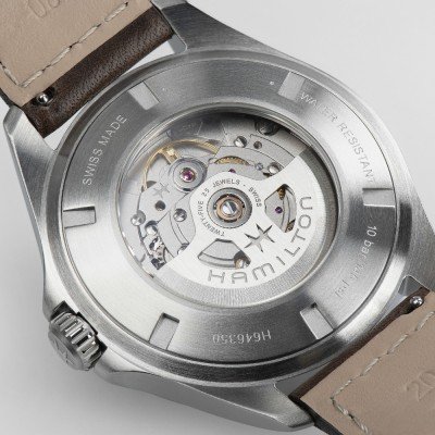 Cette montre Hamilton a un boîtier Inox 42 mm en diamètre et est équipée d'un bracelet cuir. Le boîtier contient un mouvement ETA et la montre est dotée d'un cristal Saphire..