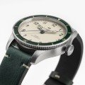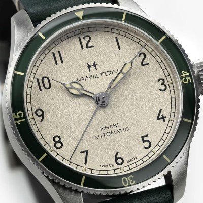 La Khaki Pilot Pioneer est un hommage au modèle 23, une montre de poche utilisée par les soldats américains pendant la Seconde Guerre mondiale, dont Hamilton a fourni plus de 27 000 exemplaires aux forces armées américaines ! Du cadran blanc texturé et des aiguilles cathédrales à la lunette verte et au bracelet en cuir assorti, chaque détail rappelle l'héritage de cette montre. Elle capture l'esprit des aviateurs pionniers de la guerre, tout en se faisant le champion de la fiabilité moderne et d'une touche rétro très tendance. Le calibre Hamilton H10 (basé sur le fiable ETA 2824) offre une importante réserve de marche de 80 heures. Le cadran grainé blanc coquille d'œuf présente des chiffres arabes, une minuterie "chemin de fer" et des aiguilles cathédrale nickelées. Le SuperLuminova sur les aiguilles et les repères de la lunette assure la visibilité dans des conditions de faible luminosité. Le verre saphir bombé inrayable renforce l'attrait rétro de la montre. La lunette verte de l'échelle du compte à rebours, dotée d'un insert en verre minéral et dont la couleur est coordonnée à celle du bracelet en cuir souple, ajoute encore à l'esthétique de la montre. Avec ses 38 mm, la montre est confortable pour la plupart des poignets. Ainsi, que vous soyez un passionné d'histoire de l'aviation ou quelqu'un qui apprécie une élégante montre de style militaire, la Khaki Pilot Pioneer est à la hauteur de l'apparence, de la sensation et de la fiabilité.