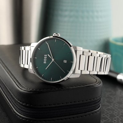 Cette montre Hugo Boss a un boîtier Inox 41 mm en diamètre et est équipée d'un bracelet Inox. Le boîtier contient un mouvement Seiko Instruments Inc. et la montre est dotée d'un cristal Minéral..
